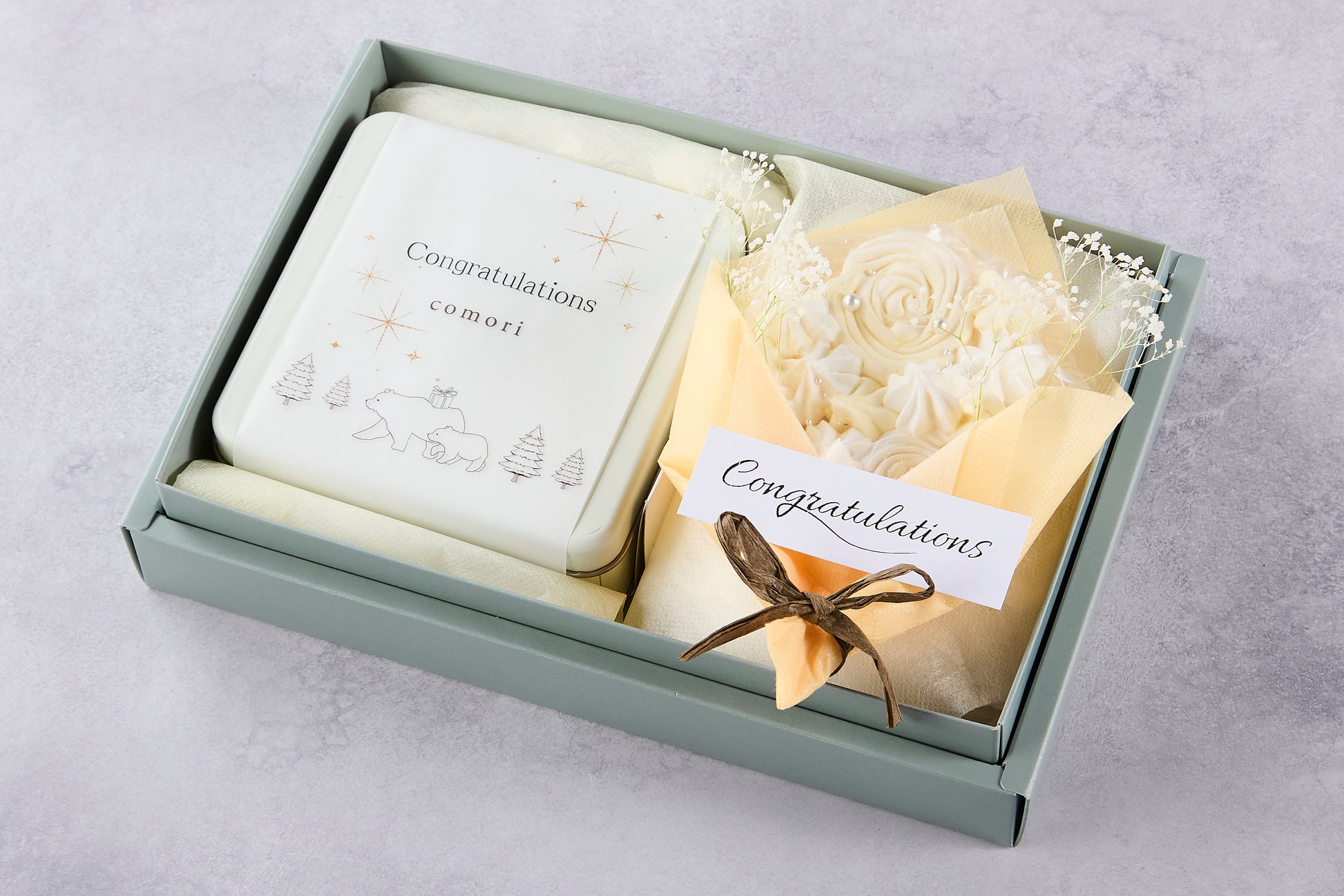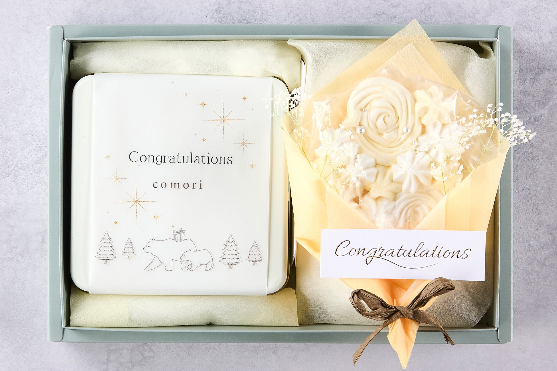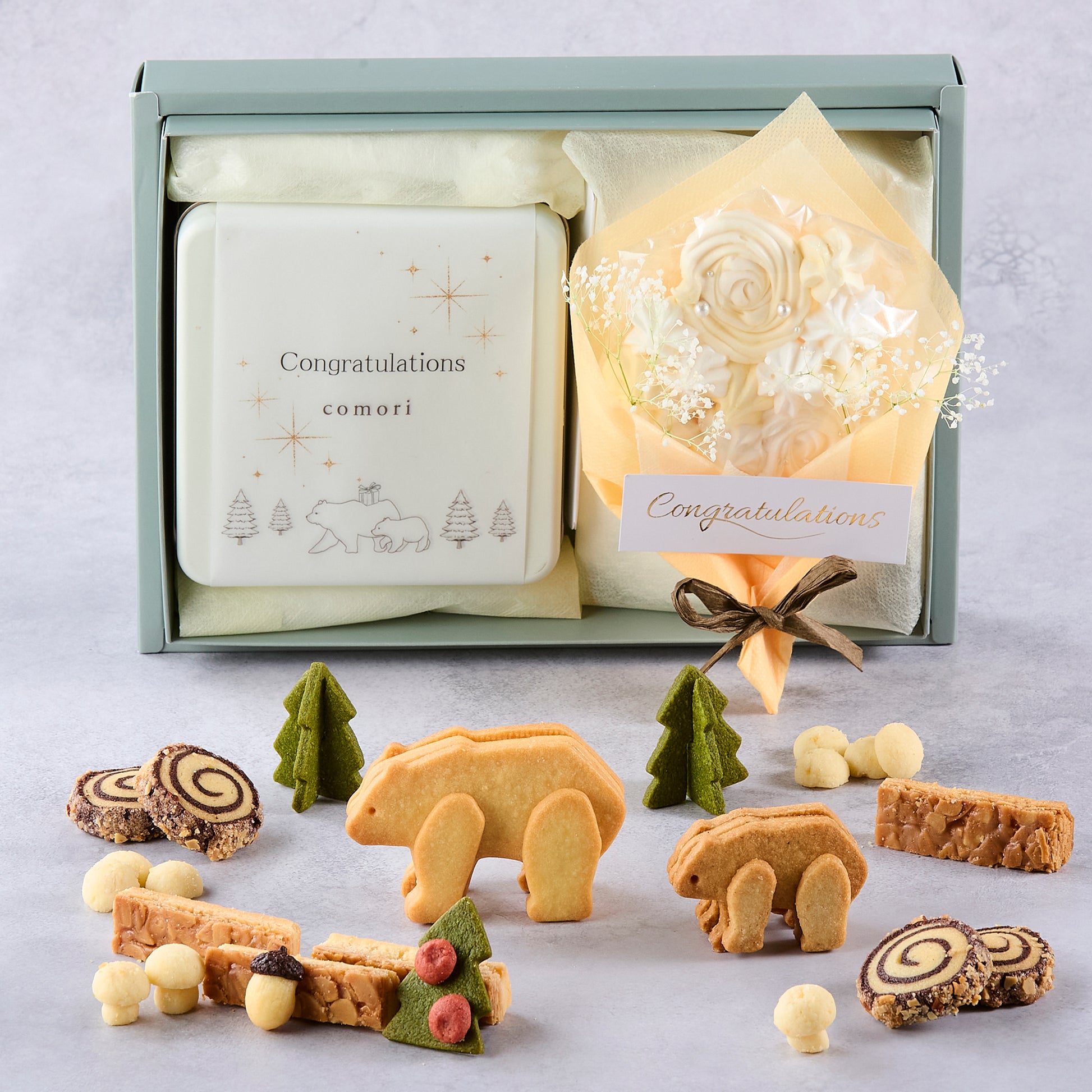 Congratulationsパッケージ(巻き紙)の小さな森のクッキー缶と、メレンゲで作った食べることができる花束を詰めたギフトボックスです。